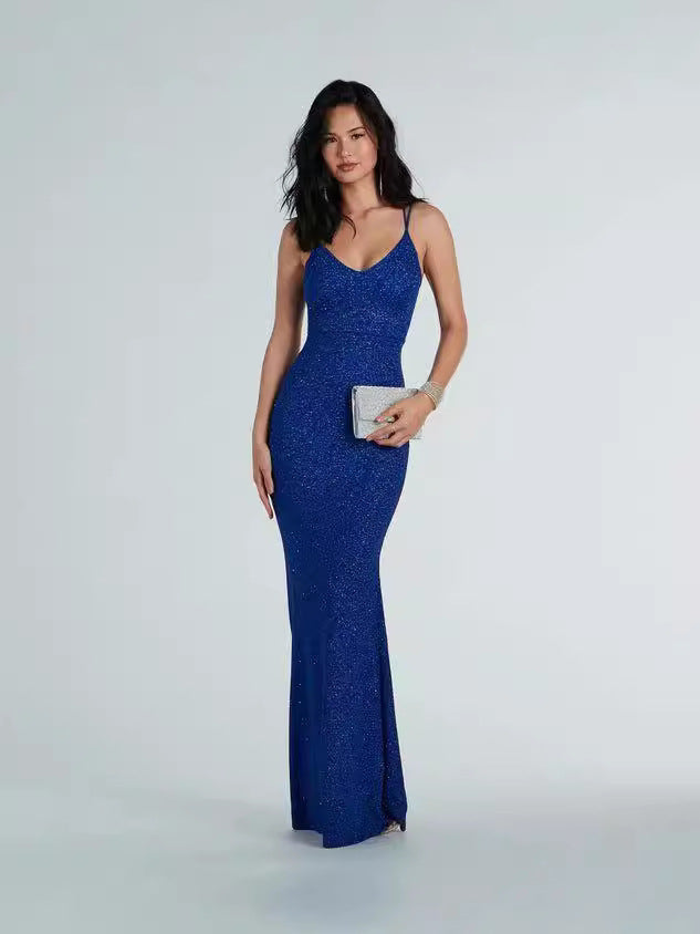 Captivate the room in the Alondra metallic glitter dress designed with breathtaking elegance and style. she shines in the light. Her cowl neckline shapes the sleeveless bodice and empire waistline that sweeps into the curve-hugging maxi silhouette of the dress. She brings a sexy show skin with the high front slit. and strappy back detailing. The dress is composed of a mesh-lined knit fabric that offers a moderate stretch. Complete your look with heels.