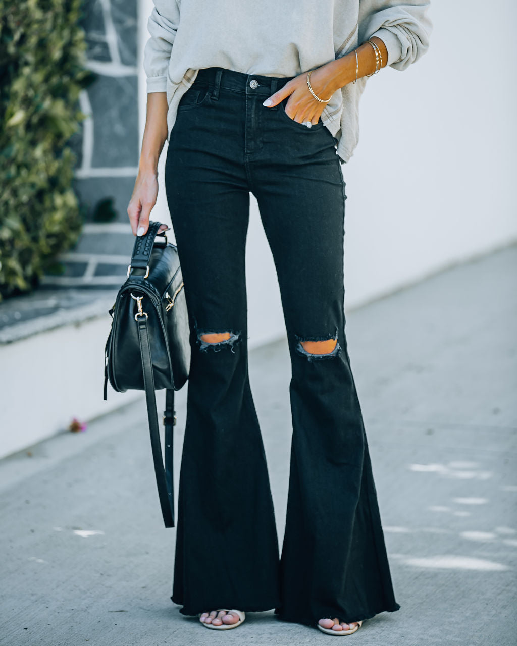 Bell bottoms are back! Our Ashby High Rise Distressed Bell Bottom Denim come in a classic black fabrication. Designed with a frayed hemline and knee distressing. Finished with a front fly zipper and button closure. Styled with the Minimal herringbone Necklace. Compass Coin Necklace. Simple Bangle Bracelet. Highland Bag. Toby Cotton Blend Lightweight Pullover. and Whimsy Heel.