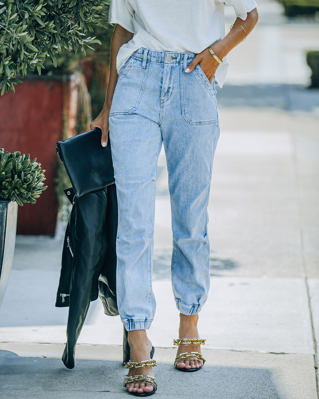 We're obsessed with the denim jogger trend! Our Avenue High Rise Denim Joggers are light wash with a high rise. Designed with 4 pockets and an elastic waist and ankles. Finished with a zipper and button closure. Styled with the Chloe Mini Necklace. Minimal herringbone Necklace. Initial Card Necklace. Simple Bangle Bracelet. Stella Crossbody Envelope Zip Clutch. Game On Cotton Distressed Tee. Gramercy Pocketed Faux Leather Moto Jacket. and Roma Chain Link Heel.
