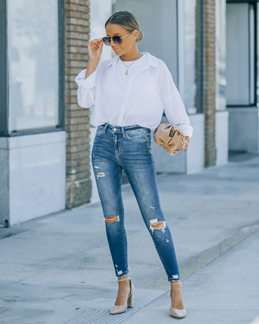 Styled with: Initial Card Necklace. Simple Bangle. Stella Clutch. Elton Blouse. and Ritz Heel.