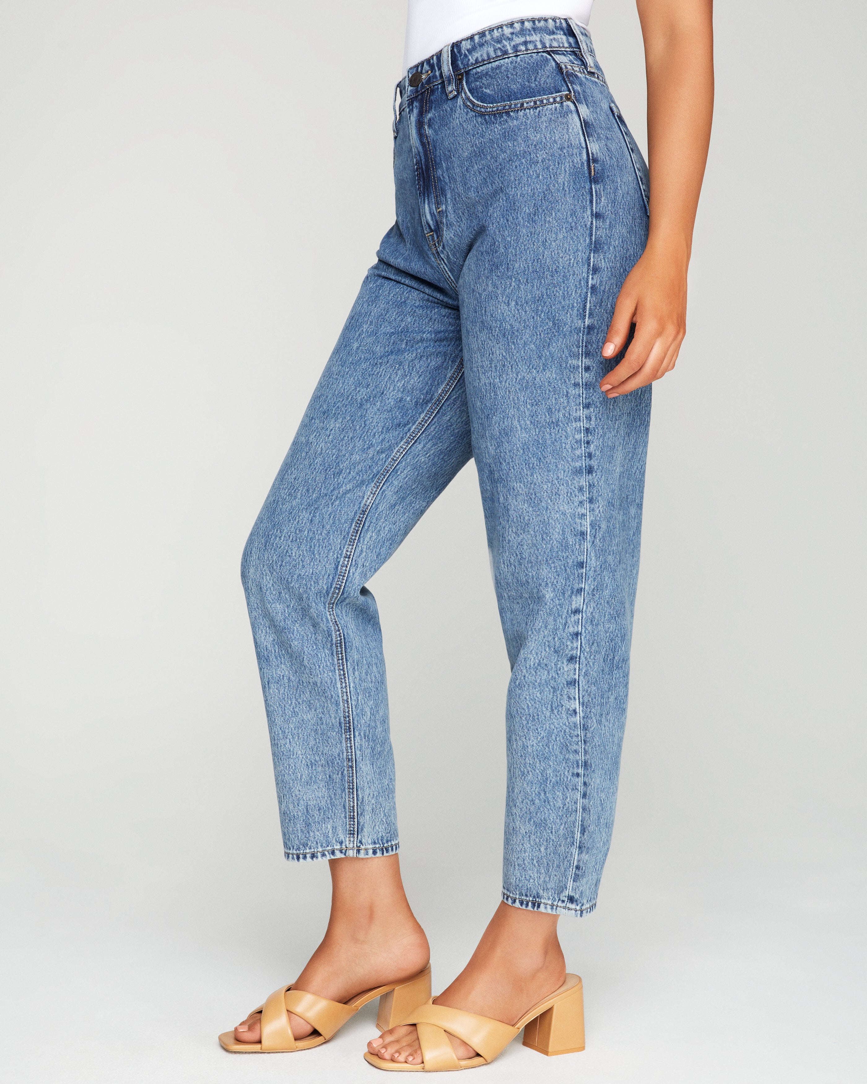 Easy and non-stretch. the Carlotta High Rise Vintage Mom Jeans in a medium wash are detailed with a flattering high waist and a tapered leg.