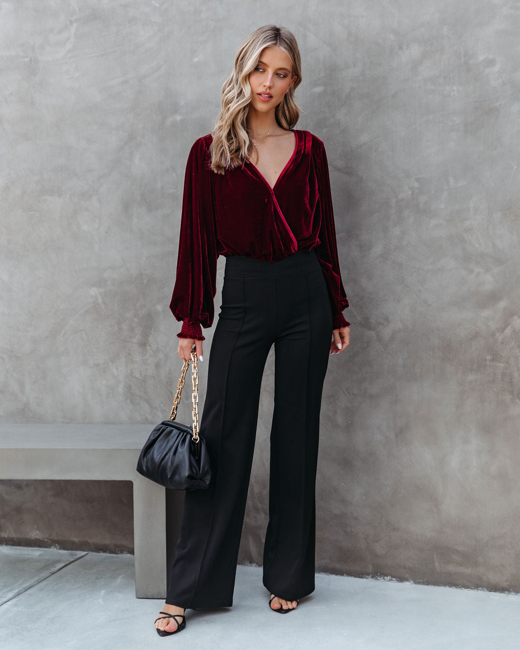 Trendy babes will love the Carter Front Crease Wide Leg Pants in black that features a high rise waistband.