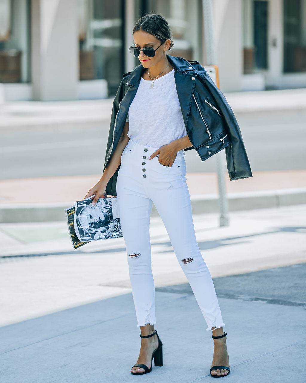 Our Charli Frayed Ankle High Waisted Skinny features a stretchy white denim. high rise and a skinny ankle length cut. Constructed with a feminine + contoured “like a gloveâââ€?fit.