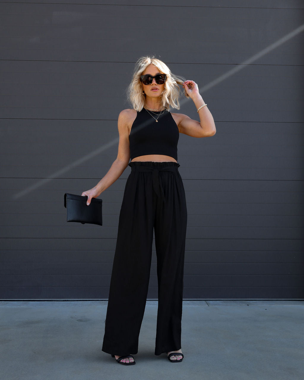 Perfect for vacay. the Del Ray Waist Tie Wide Leg Pants in black feature a relaxed fit and a subtle front tie detail.