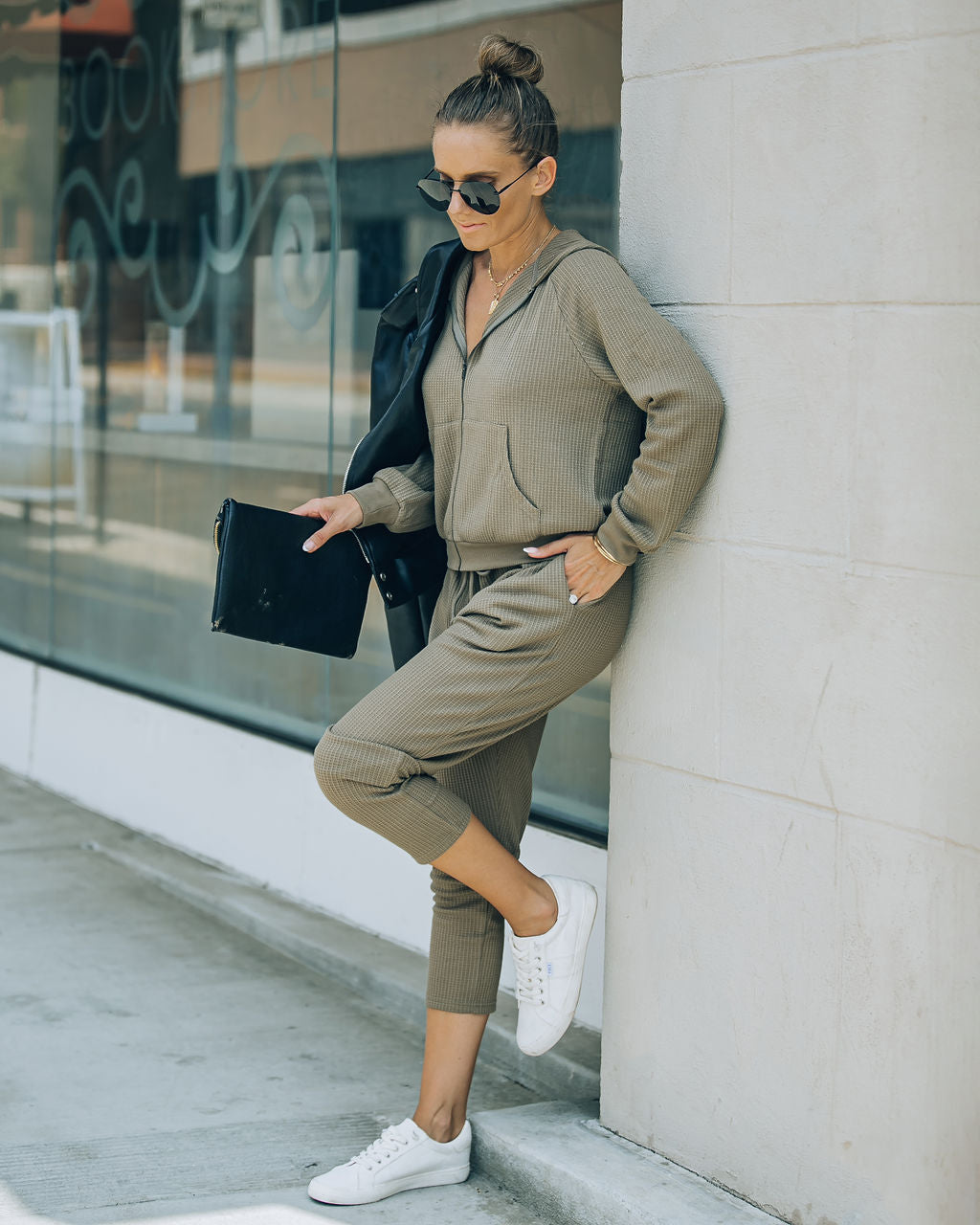 You'll love to lounge in the Everly Waffle Knit Zip Up Hoodie in olive that features a hood.