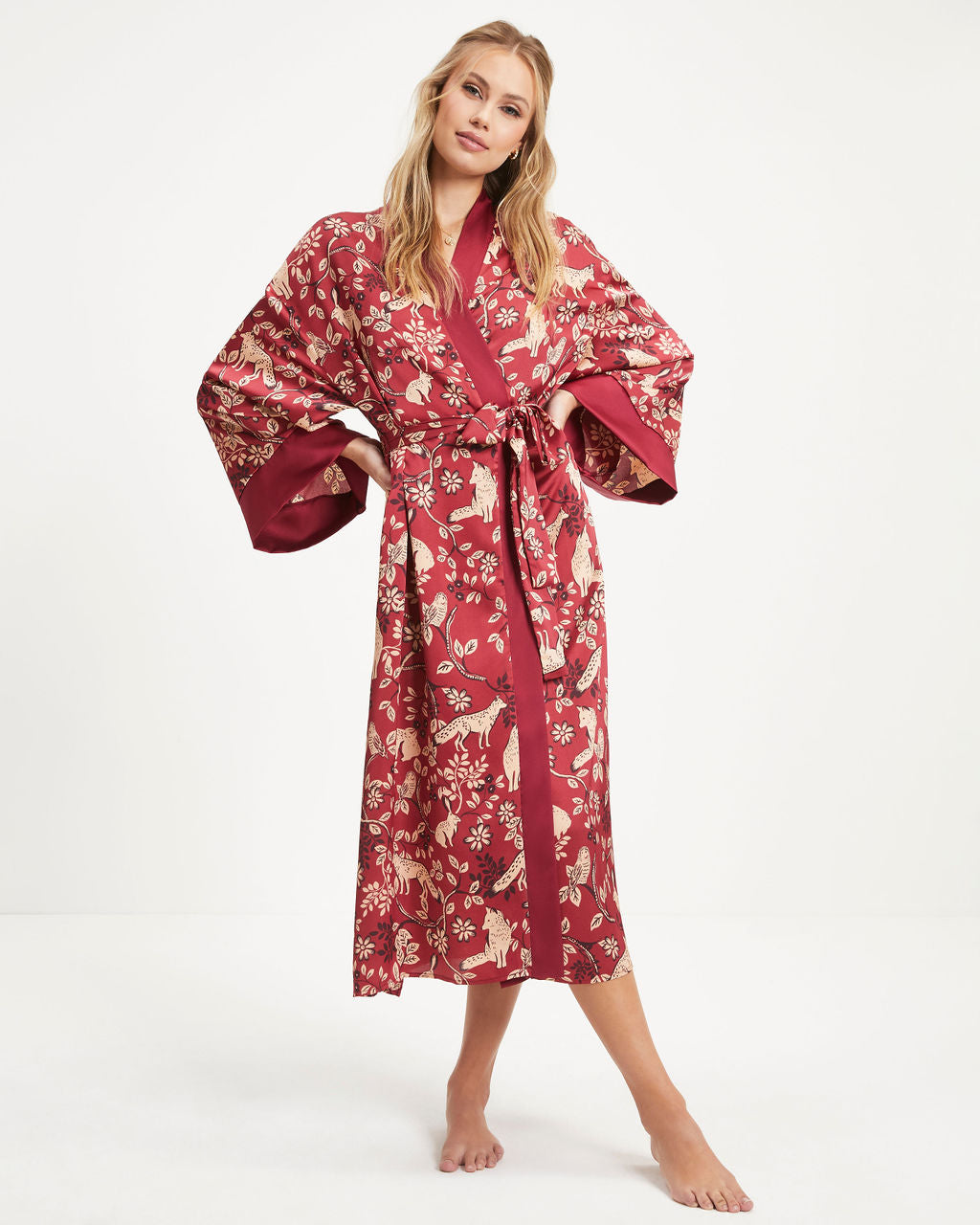 You'll love to gift the Galilea Satin Printed Kimono Robe in brick that features a waist tie closure.