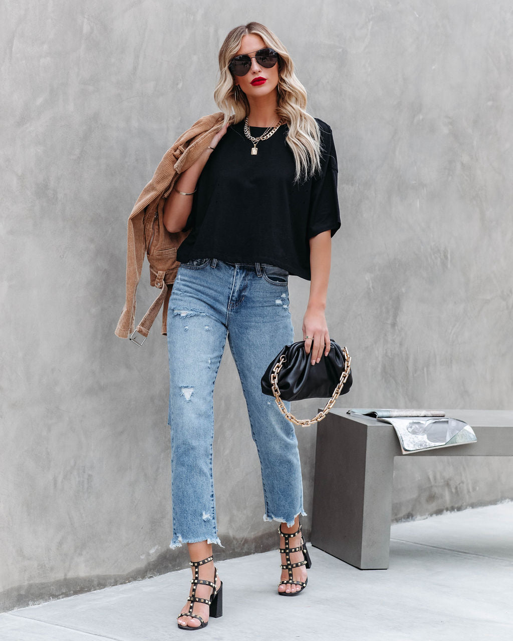 //OSHNOW//Best Selling Silhouette// Your new fav chilling on the couch top! Our Her Cotton Cropped Tee in black features a crew neckline. Designed with short sleeves and a distressed fabrication. Styled with the Perfect Hoop Earrings. This Or That Chain Toggle Necklace. Initial Card Necklace. Chloe Mini Necklace. Simple Bangle Bracelet. Chic Crossbody Chain Pouch Bag. Michelle High Rise Slim Straight Denim. Amaya Pocketed Corduroy Moto Jacket. and Roxy Studded Heeled Sandal.