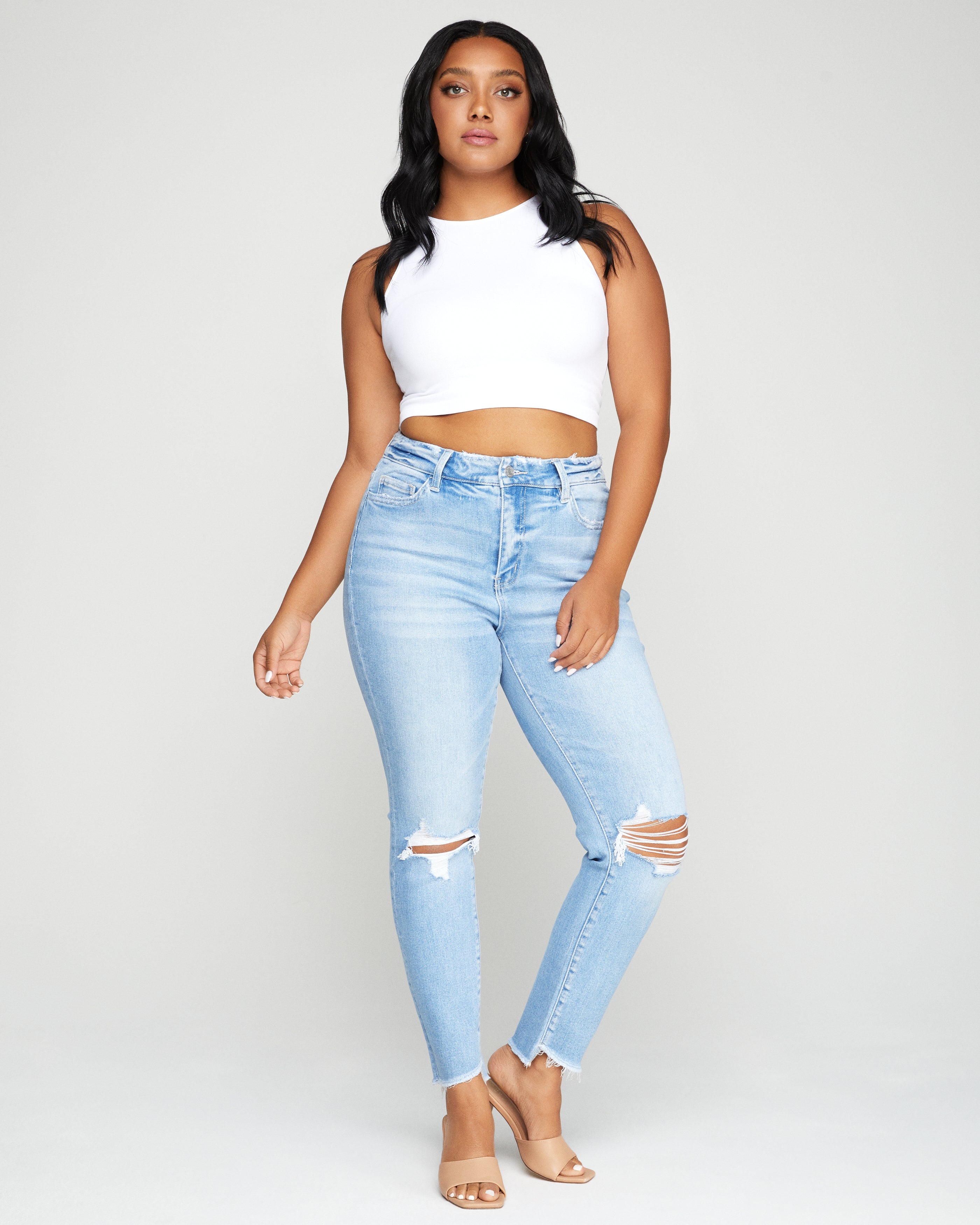 Fitted and flattering. the Loralei Frayed Ankle High Waisted Skinny. in medium wash feature a frayed hemline.