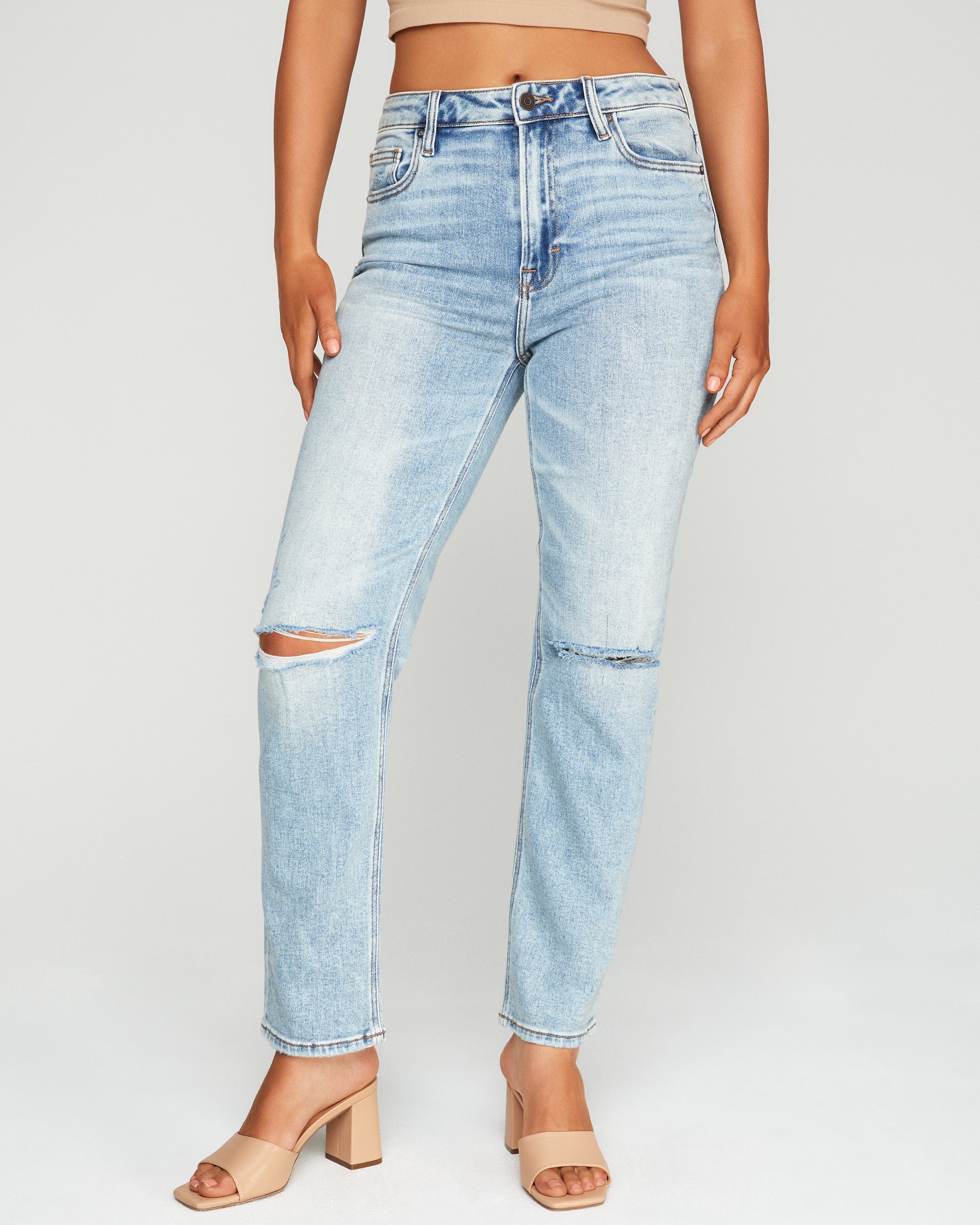 Trendy and classic. the Morgan High Rise Mom Jean in light wash feature light distressing and a high rise.
