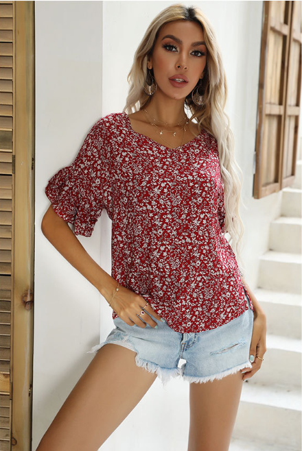 Embody everyday romance in our Sidney Floral Shimmer Peplum Blouse! This wine colored top features shimmer gold and silver florals. Designed with flutter sleeves and a crew neckline. Styled with the Emperor Coin Necklace. Minimal Herringbone Necklace. Stella Crossbody Envelope Zip Clutch. Nia High Rise 90'S Flare Denim and Colby Faux Suede Heeled Bootie.